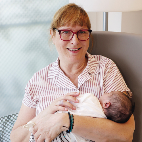 Kompetenz und Einfühlungsvermögen bringt Stadlbauer mit. Bis zu ihrer Pensionierung 2023 war sie in der Klinik als Seelsorgerin tätig. „Schon während meiner aktiven Zeit begleitete ich Mütter auf der Neonatologie seelsorglich. Als es einmal ein Kind gab, das dringend jemanden zum Kuscheln brauchte, bin ich eingesprungen.“ Ihre Dienste sind flexibel und werden von der Station koordiniert. Die zehn Kolleginnen* im Baby-Besuchsdienst, der seit 2023 existiert, kommen aus völlig unterschiedlichen Berufen, beispielsweise der Pflege.